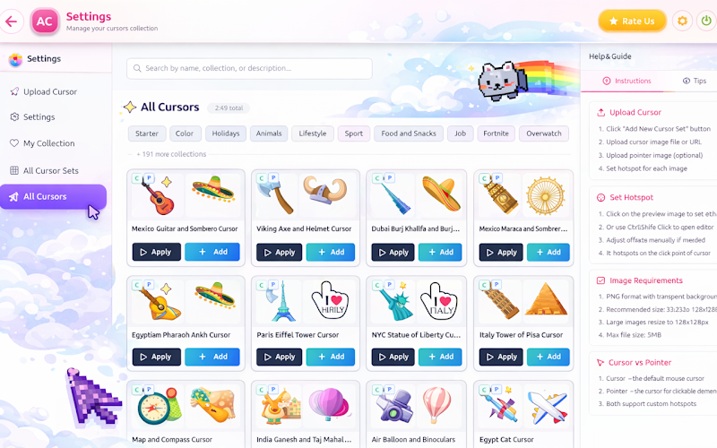 Choose from a large collection of ready-made cursors or upload your own images.