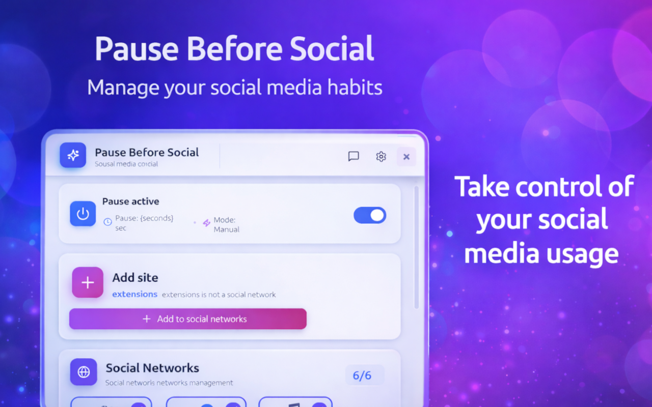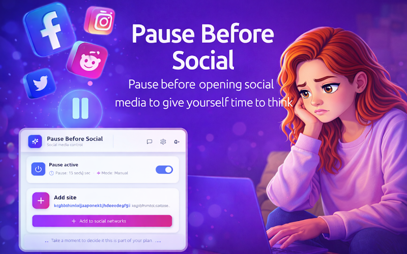 Many people open social media automatically, without thinking. Pause Before Social interrupts this habit by adding a brief moment of awareness, helping you make more intentional decisions about how you use your time online. Instead of blocking access, it encourages mindful social media use and better focus.