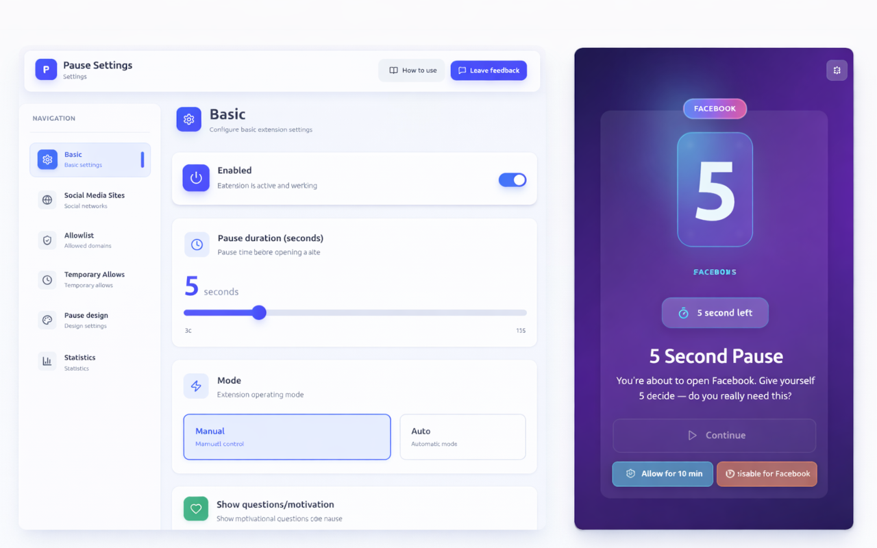 Pause Before Social is ideal for users who want to reduce social media addiction, improve productivity, and regain control over their online habits—without completely blocking social platforms.