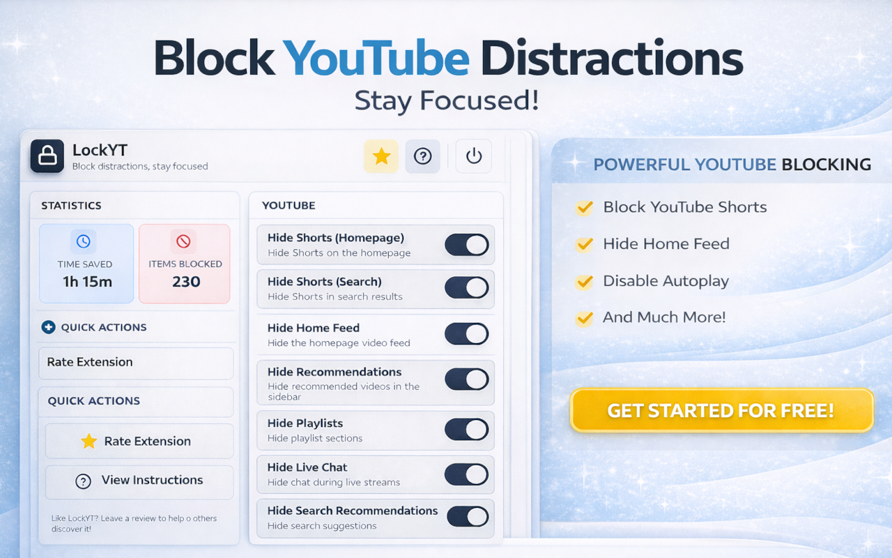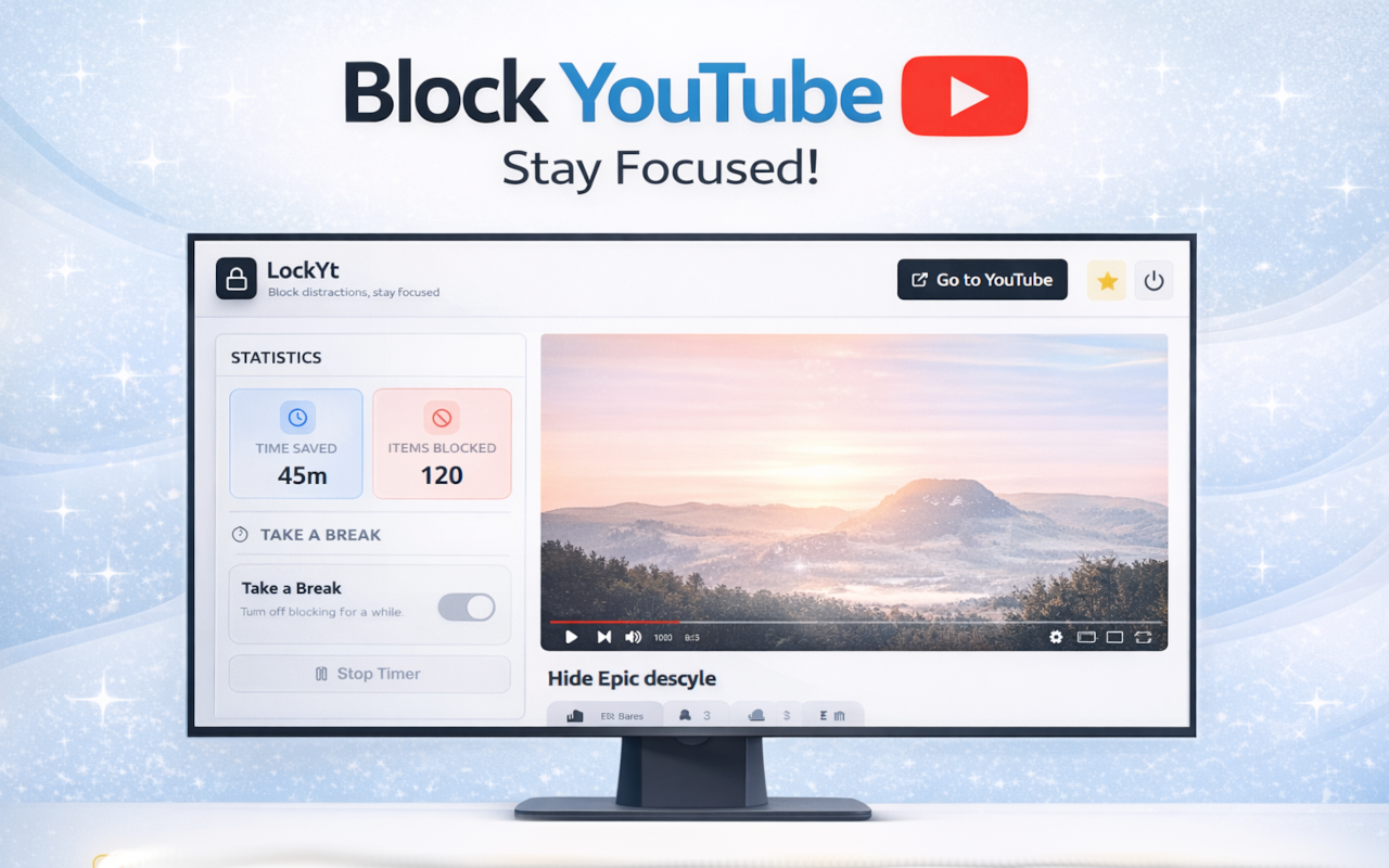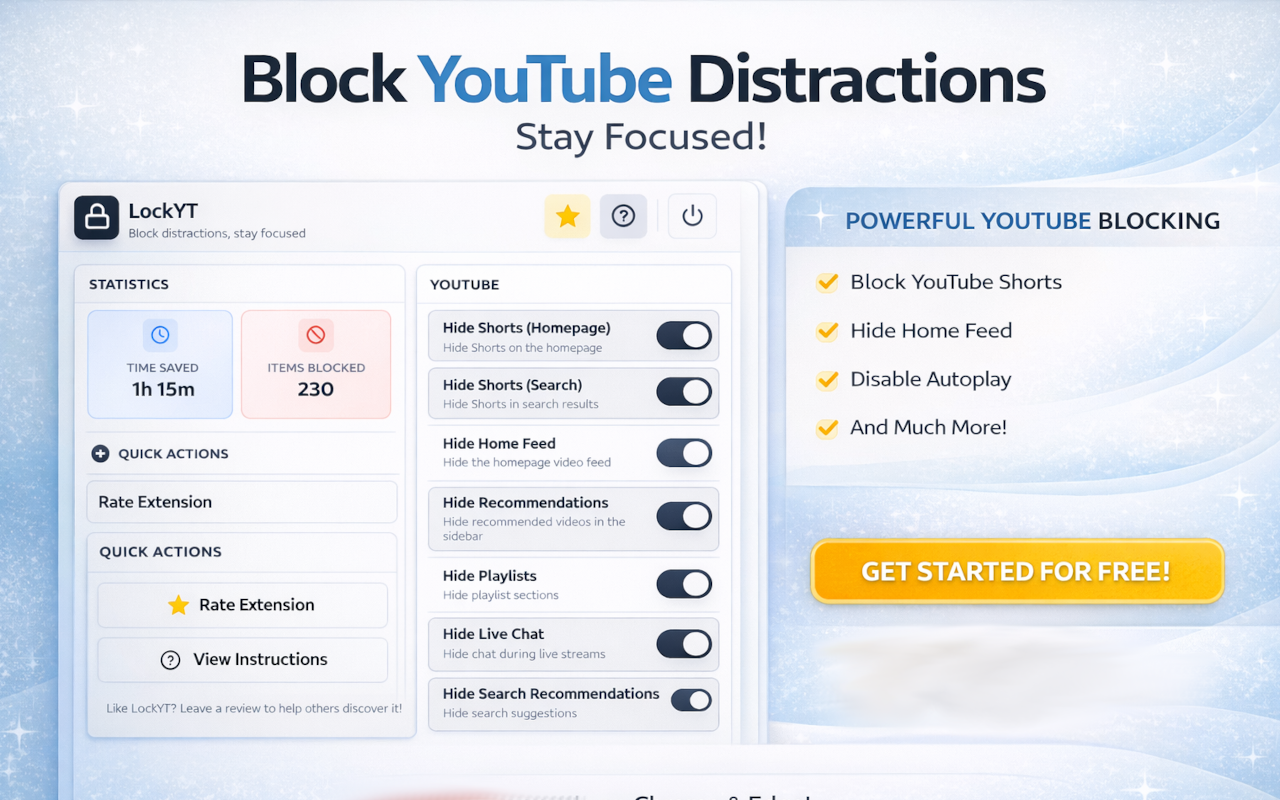 Turn YouTube into a focused workspace. LockYt blocks Shorts, recommendations, comments, and distractions to boost focus and productivity.